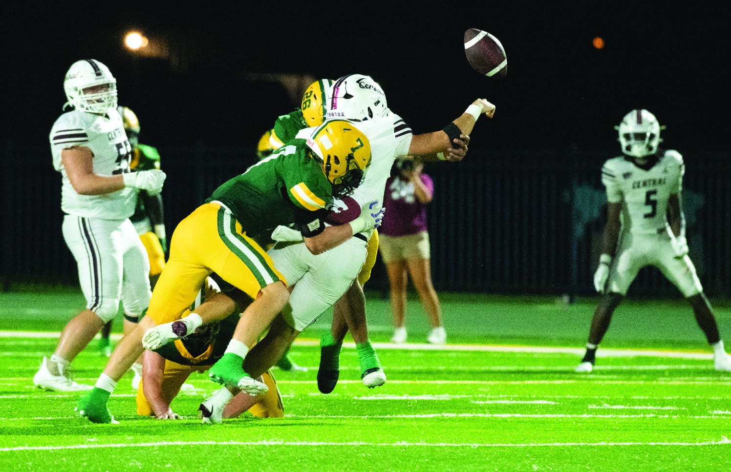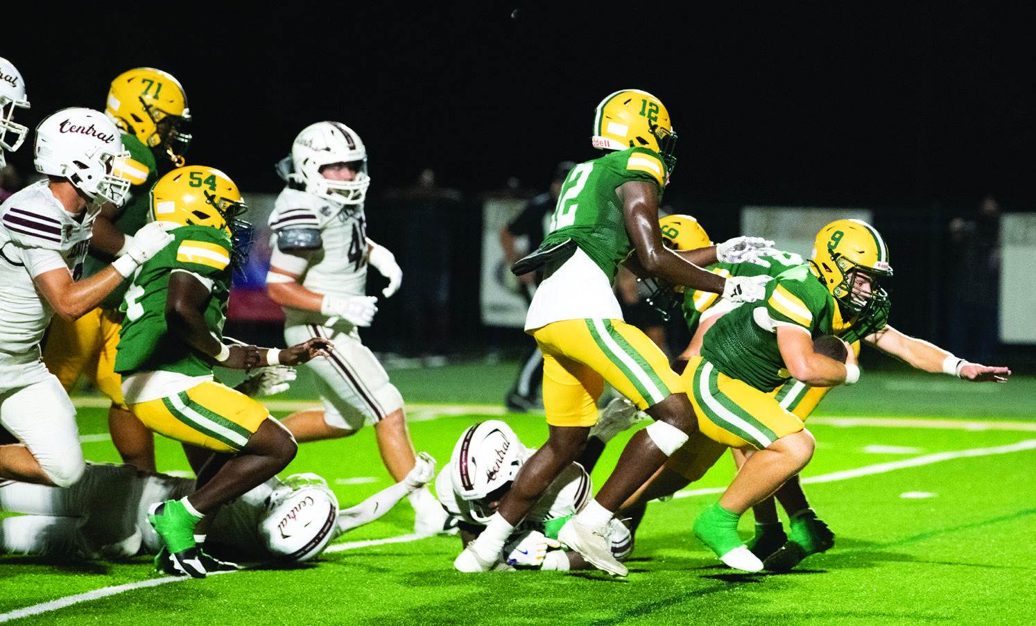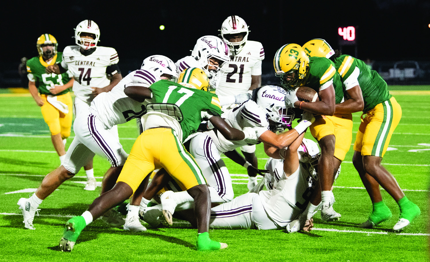Central answered with a four-play scoring drive after recovering an onside kick attempt at the 48. Jacori Platt’s eight-yard quarterback keeper pushed the lead to 39-15 with sevenminutes remaining in the game.