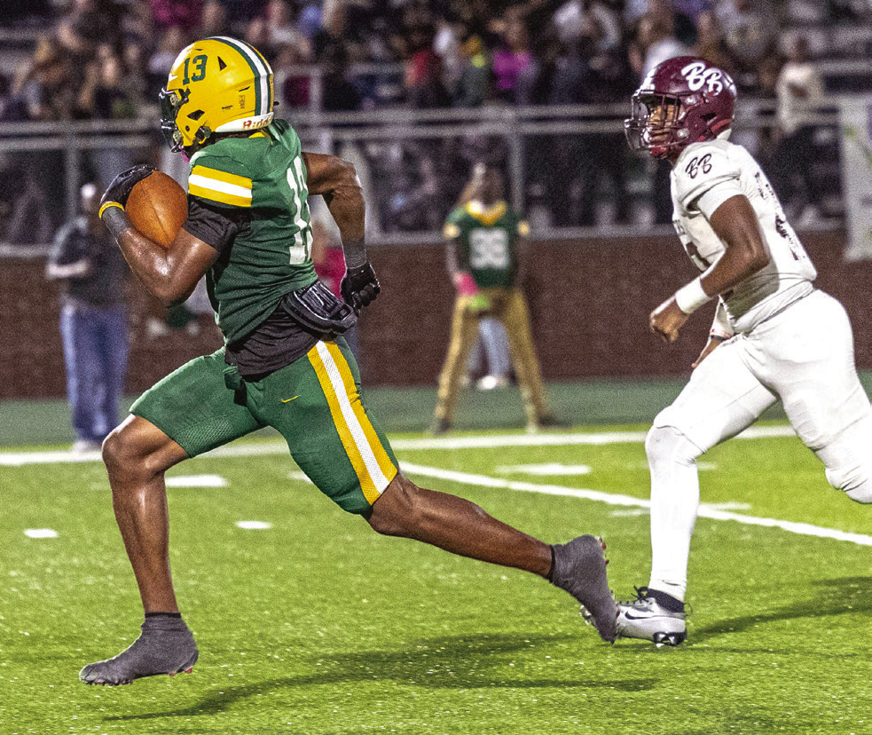 BIG PLAY — Cecilia’s Braylon Calais (13) sprints into the open for the Bulldogs against Breaux Bridge on Friday. Calais had a touchdown run and a touchdown pass in a 59-0 win over the Tigers.