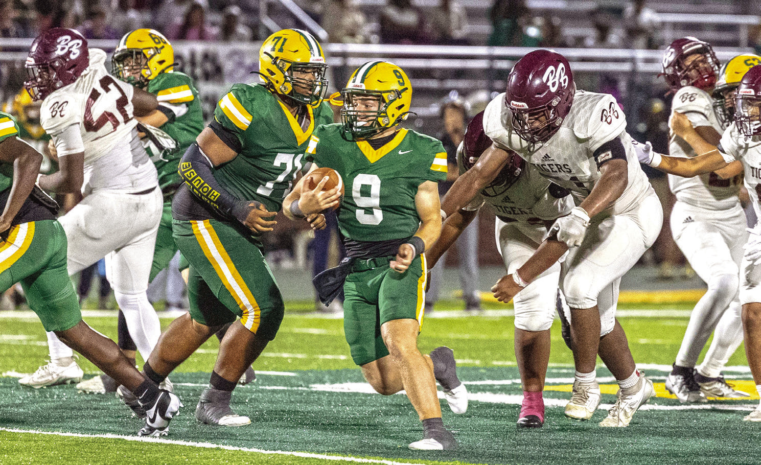 I N CONTROL — Cecilia quarterback Collin Dore (9) finds a running lane against Breaux Bridge on Friday. Dore threw for 128 yards and three touchdowns and rushed for a teamhigh 69 yards and a touchdown in a 59-0 win. (Robby Bishop)