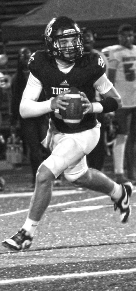 ROLLING OUT — Breaux Bridge quarterback Caynon Ardoin (13) rolls to his right looking for a receiver to throw to during Thursday’s home game against Northside. The Tigers play a district home game against Beau Chene on Friday. (Chris Landry)