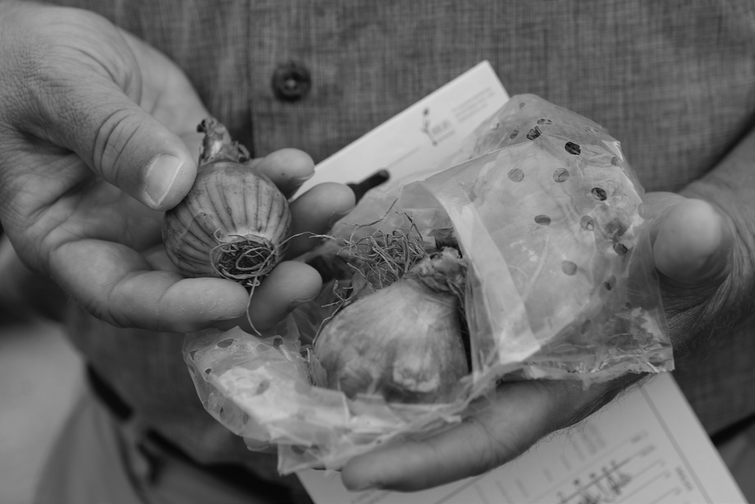 Bulbs typically are packaged in perforated plastic or paper bags, and they look a lot like onions — round with papery skins. If you’re shopping in person, take some time to carefully examine the bulbs. Squeeze them — they should feel firm with no soft spots. Make sure there are no signs of mold growing on them.