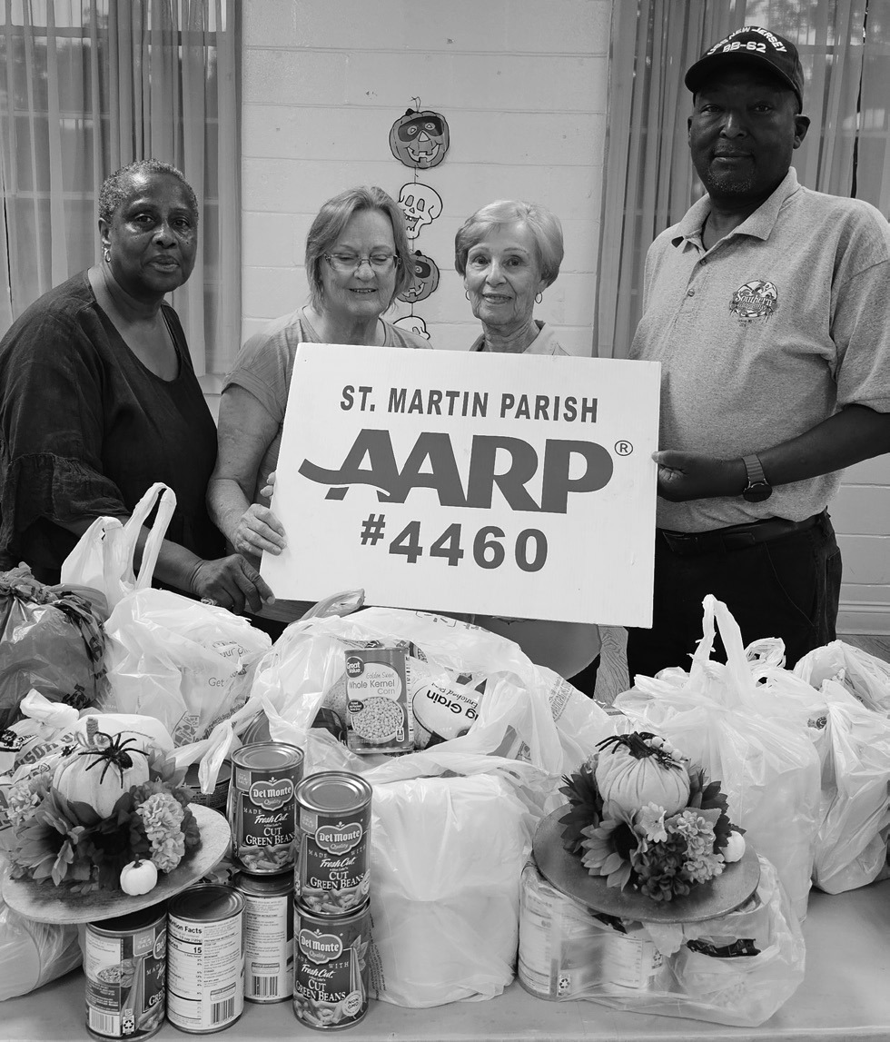 The St. Martin Parish AARP Chapter #4460 meeting was held on October 16th at the Magnolia Center in St. Martinville. Landmark of Acadiana sponsored the meal for the meeting. Canned goods were collected for St. Bernard St. Francis Food Pantry located in Breaux Bridge. Pictured left to right AARP officers Liza Chance, Bonnie Ridley, Barbara Bird, and John Dugas. (Submitted)