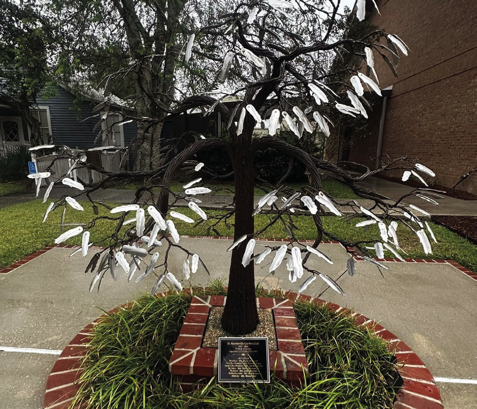 In 2008, the club voted to pay lasting tribute to all deceased members through a meaningful memorial. The committee commissioned landscape architect Brenda L. Wieddekehr to design a unique sculpture - a copper wire and stainless steel tree inspired by the majestic Louisiana Live Oak. Dedicated in June 2009, the handcrafted memorial features stainless steel leaves, each engraved with the name of a Garden Club member who has passed away.